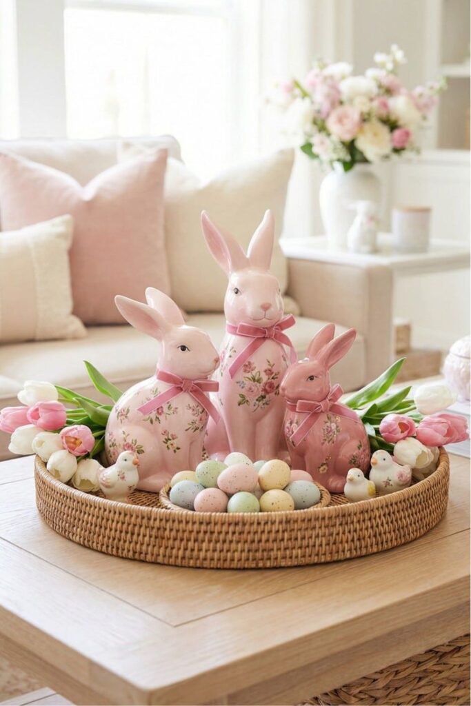 Use a wicker basket filled with small bunny figures and decorative eggs. Add a little moss or greenery to soften the look. It’s sweet, simple, and perfect for a more traditional Easter table.