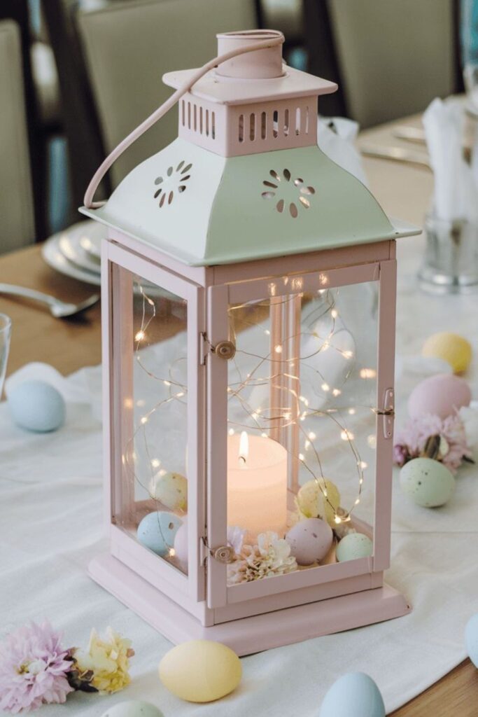 Place fairy lights inside a lantern for a soft, cozy glow. You can add a few eggs or greenery around the base to tie it into the theme. This works beautifully for brunch tables or evening gatherings.