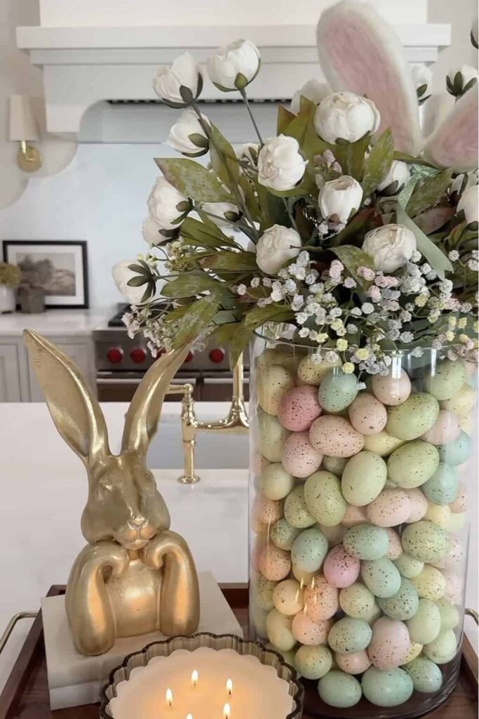 Fill a tall vase with decorative eggs, then top it with a bouquet of fresh flowers. Add a large candle and a bunny beside it to create height and balance. This centerpiece feels elegant while still keeping the Easter theme fun.