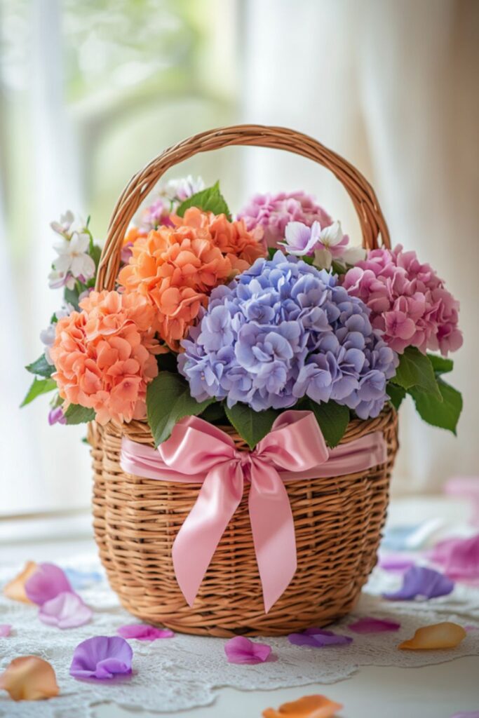 A wicker basket overflowing with flowers instantly says spring has arrived. Choose soft blooms like tulips, daisies, or ranunculus for that light seasonal vibe. It’s classic, fresh, and works on literally any table.