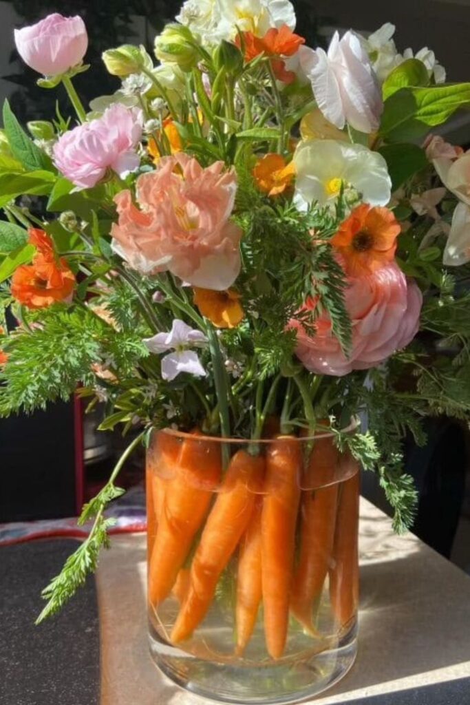 Place whole carrots inside a clear vase, fill with water, and add flowers on top. The orange color shows through the glass and becomes part of the design. It’s unexpected, a little quirky, and totally adorable.