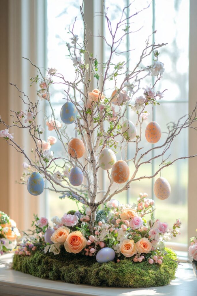 Set up a small decorative tree and hang pastel eggs from the branches. It adds height, color, and a slightly whimsical feel to your table. Think of it as Easter’s version of a mini holiday tree.