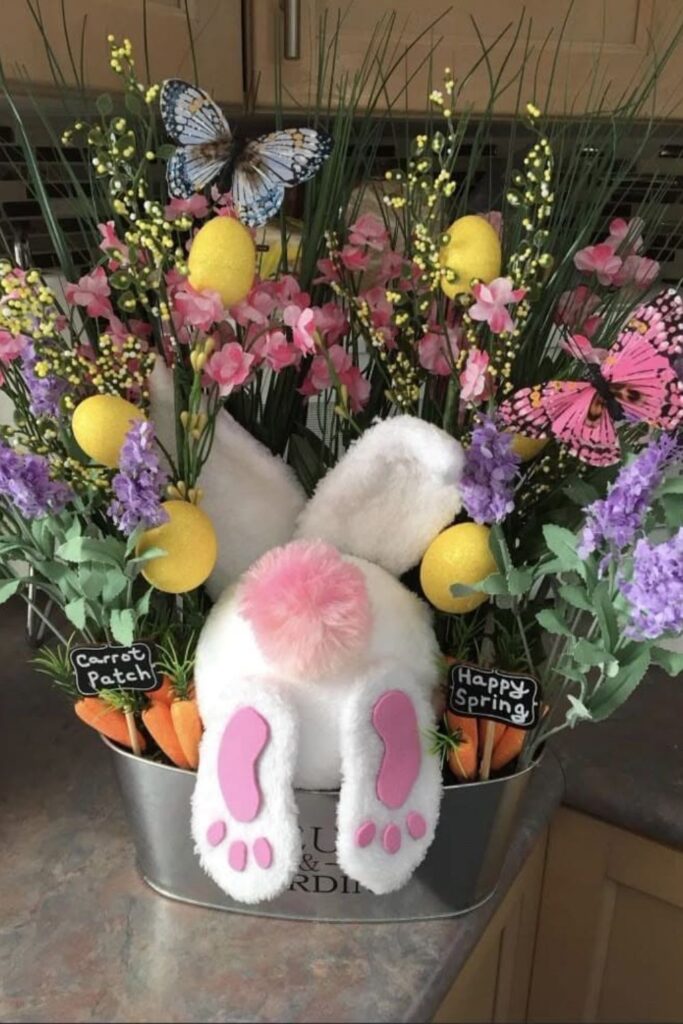 Fill a metal bucket with carrots and tuck a bunny figure inside like it’s burrowing for snacks. It’s playful and adds a bit of humor to your setup. Kids especially love this one.