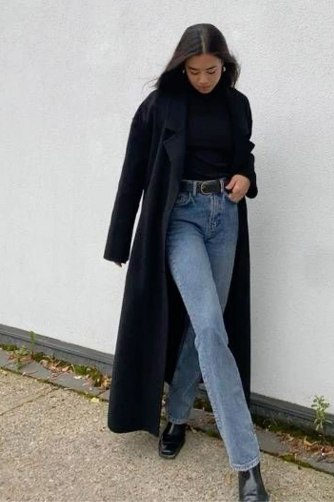 Keep it simple with a monochromatic outfit—black Chelsea boots paired with black skinny jeans and a sleek black coat.