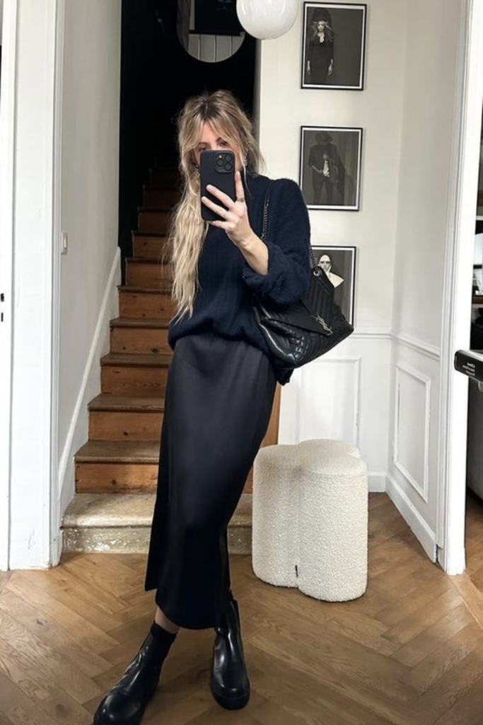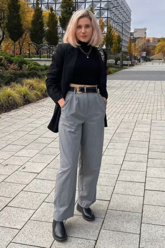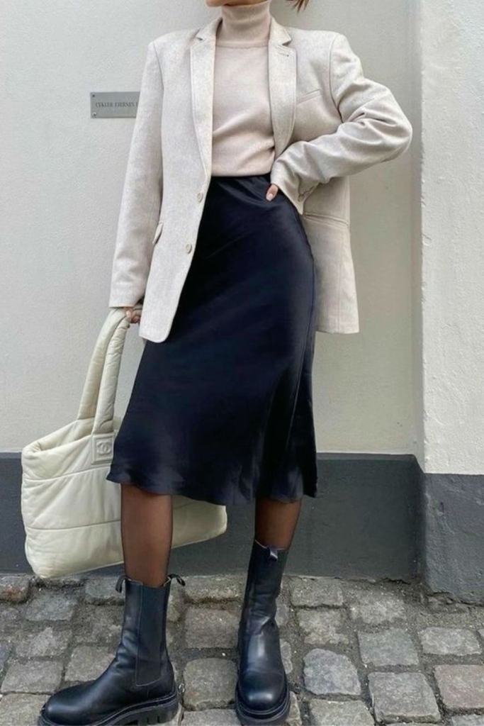A fitted turtleneck or a chic blouse completes the outfit, making it perfect for a day at the office or a dinner date.
