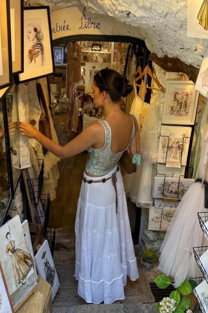 A soft sage lace-trimmed crop top styled with a floaty white tiered maxi skirt feels effortlessly romantic. It’s the kind of outfit you’d discover in a tucked-away boutique and end up wearing on repeat for the rest of your trip.