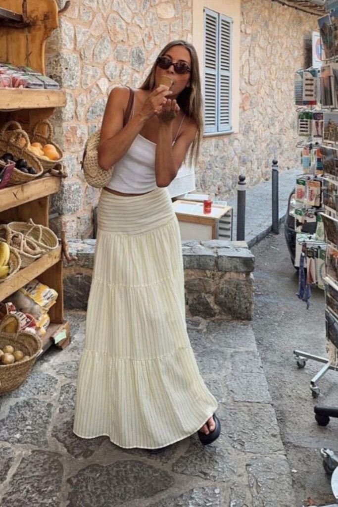 A lightweight cami tucked into a textured maxi skirt creates a look that feels easy yet put together. Add flat sandals and a woven bag, and it works for just about any summer plan.