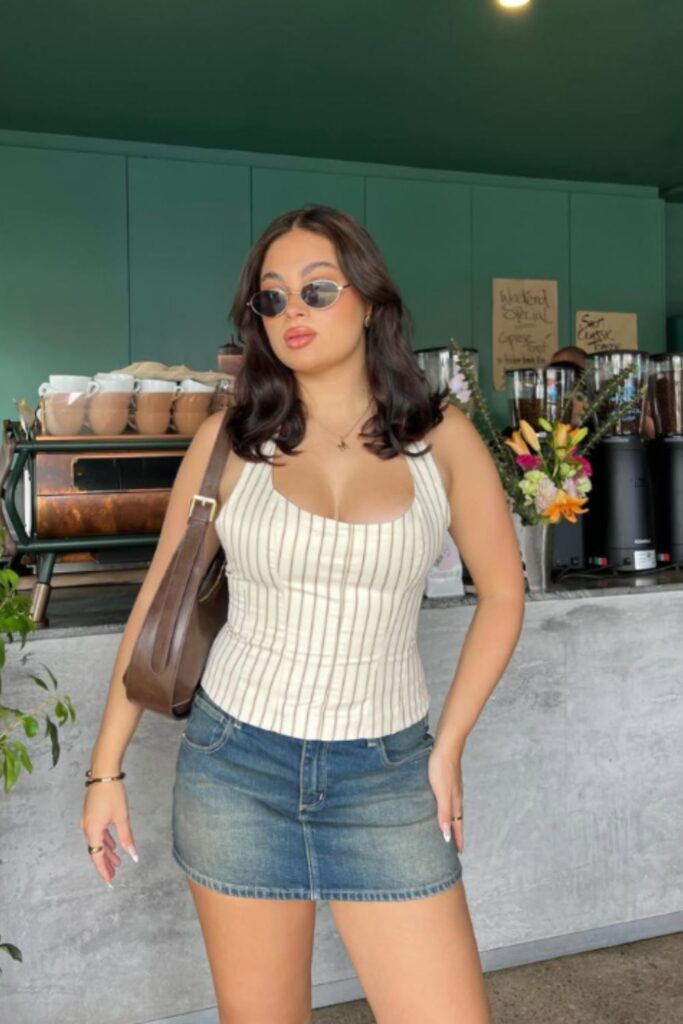 Okay, first up—the classic chic vibe! Pair your mini denim skirt with a striped corset top for that effortlessly put-together-but-still-casual look. Add some cute white sneakers or kitten heels, and you’re basically ready for brunch, a date, or anything in between. Talk about versatility!
