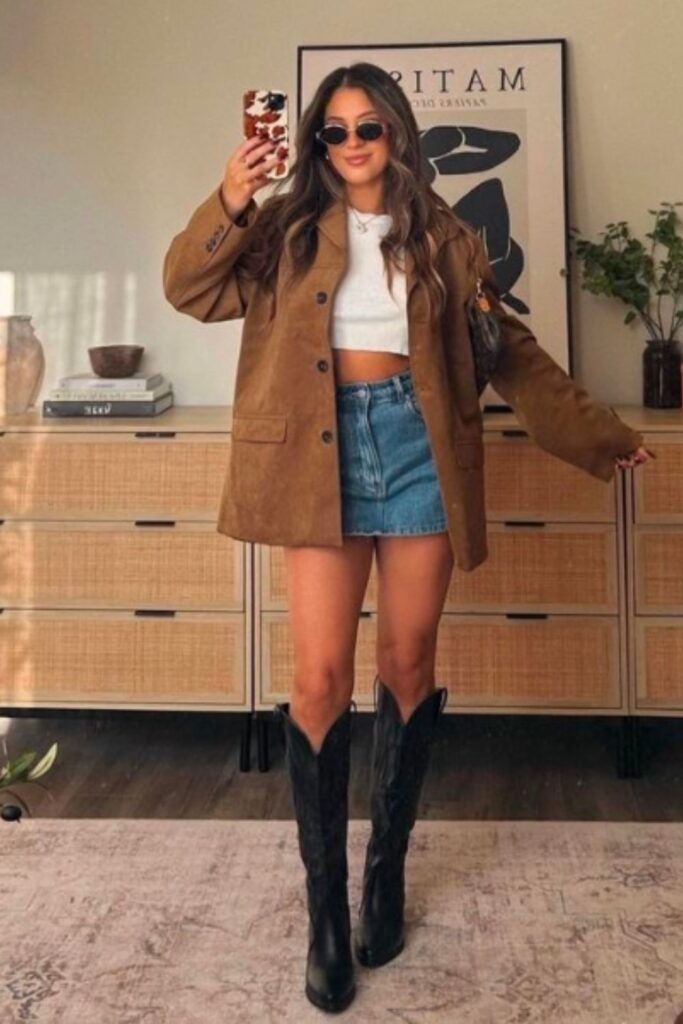 Channeling cool AF vibes? Throw on an oversized jacket with a crop top and your mini skirt, then finish the look with cowboy boots. It’s giving all the Western-meets-streetwear feels. You could easily rock this to a concert or a fun hang with friends. Yeehaw, queen!