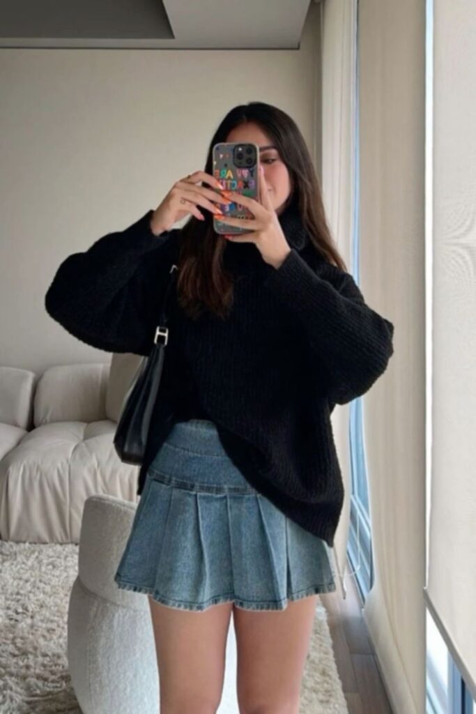Can we talk cozy-cute perfection? Oversized sweaters will forever be a vibe, and when combined with a pleated mini denim skirt… just mwah. Add sneakers or cute loafers for that “I just stepped out of a Pinterest board” feel.