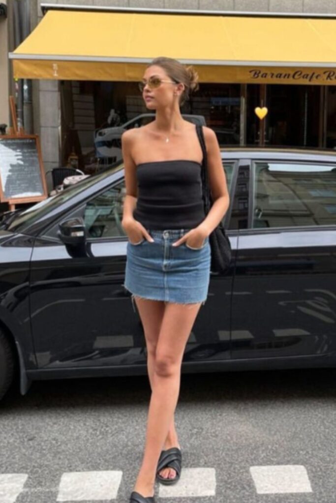 This one’s a no-brainer when you’re wondering what to wear with a jean mini skirt. The off-shoulder fitted top brings a sleek, elegant silhouette that’s equal parts edgy and glam. Add strappy sandals, and BOOM—you’ve hit style gold.