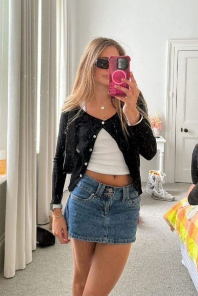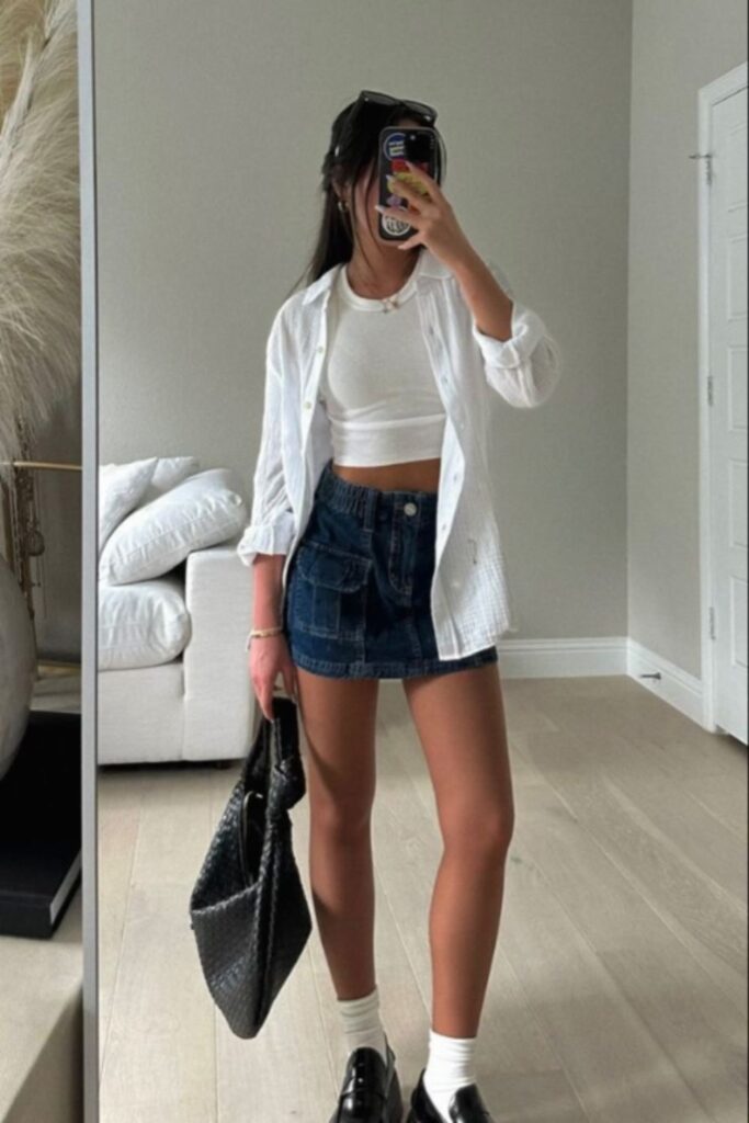 Want to serve up some luxe academia vibes? Layer a crop vest top over a crisp button-down shirt and style it with your short denim skirt. It’s preppy but with an edge that screams fashion queen goals. Finish with loafers and trust me, you’ll look like you stepped out of a TikTok style inspo reel.