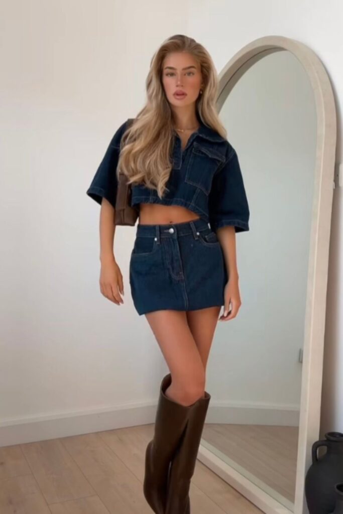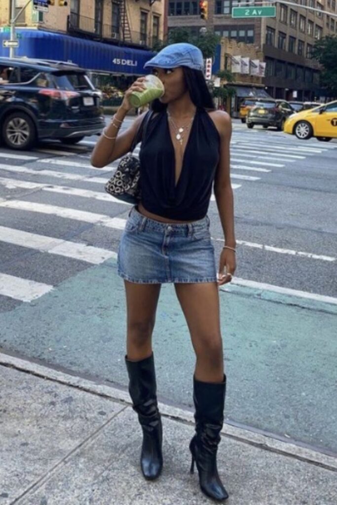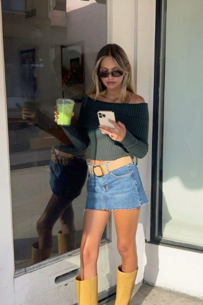 Wanna channel those “main character” vibes? Pair your denim mini with an off-shoulder ribbed top, slip on a statement belt, and finish it off with some long chunky boots. This one’s equal parts glam and chill.