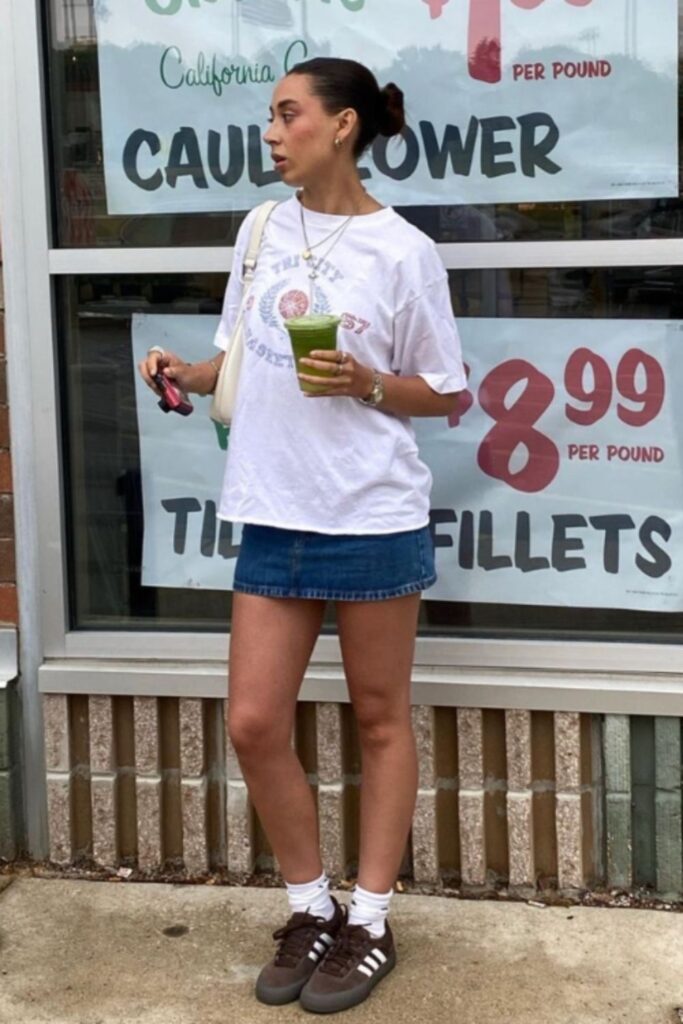 Who doesn’t love an easy, laid-back vibe? Grab a quirky graphic tee, tuck it into your short denim skirt, and voilà—you’re rocking the ultimate “effortless cool” look. Throw on sneakers to nail this outfit.
