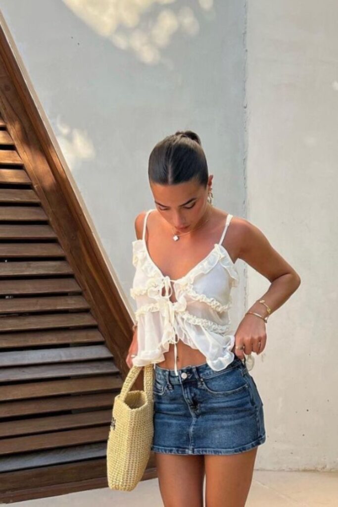 This one’s giving ultra-girly vibes, and we LOVE it. A ruffle strappy top with a front bow paired with a mini denim skirt? Adorable AND chic. Add some espadrilles or sandals, and you’ve got a look that screams summer picnics and cute Insta pics.