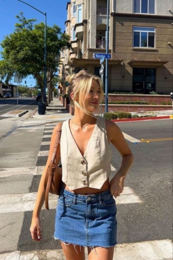 Linen waistcoat with a mini skirt? Say less. It’s the ultimate casual-yet-polished outfit that feels perfect for warm weather days. Pair it with flat sandals or loafers for an effortlessly chic look that could take you from the farmer’s market to rooftop drinks.