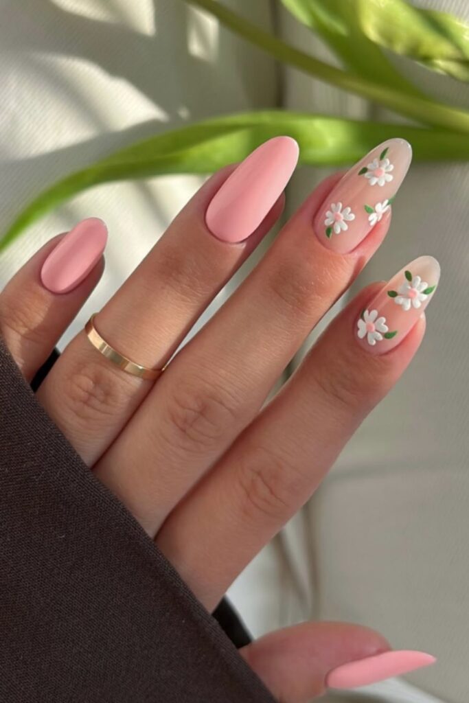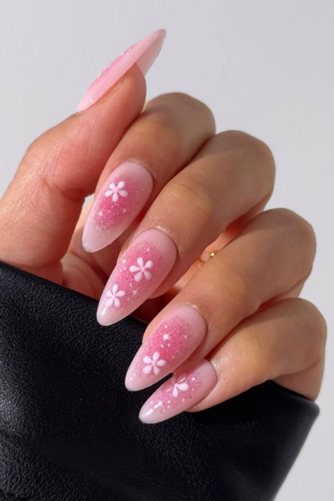There’s something about a soft pastel pink paired with tiny white florals that just feels effortlessly pretty. This design leans into that light, airy summer vibe while still looking polished enough for any occasion. It’s the kind of manicure that works with literally everything in your closet, from casual daytime fits to dressed-up evenings.