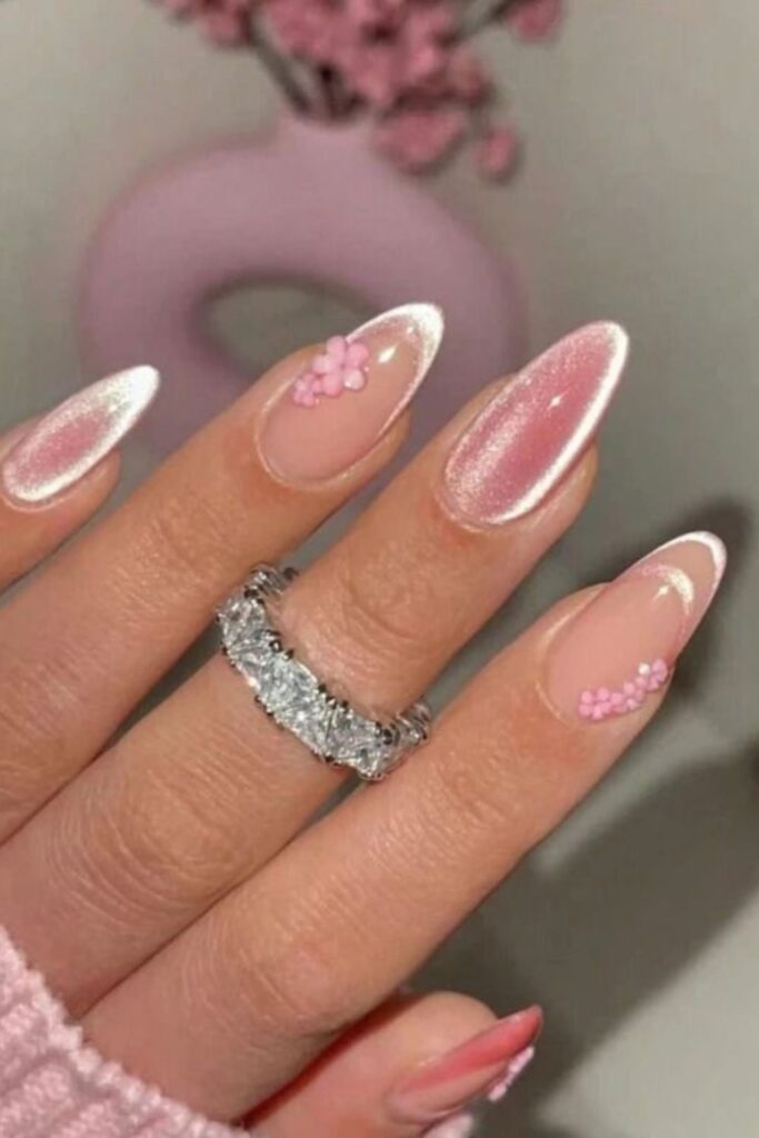 This design brings in soft pastel pink tones and elevates them with floral details and tiny stone accents. The added texture gives it a slightly luxe feel, making your nails look like little pieces of jewelry.