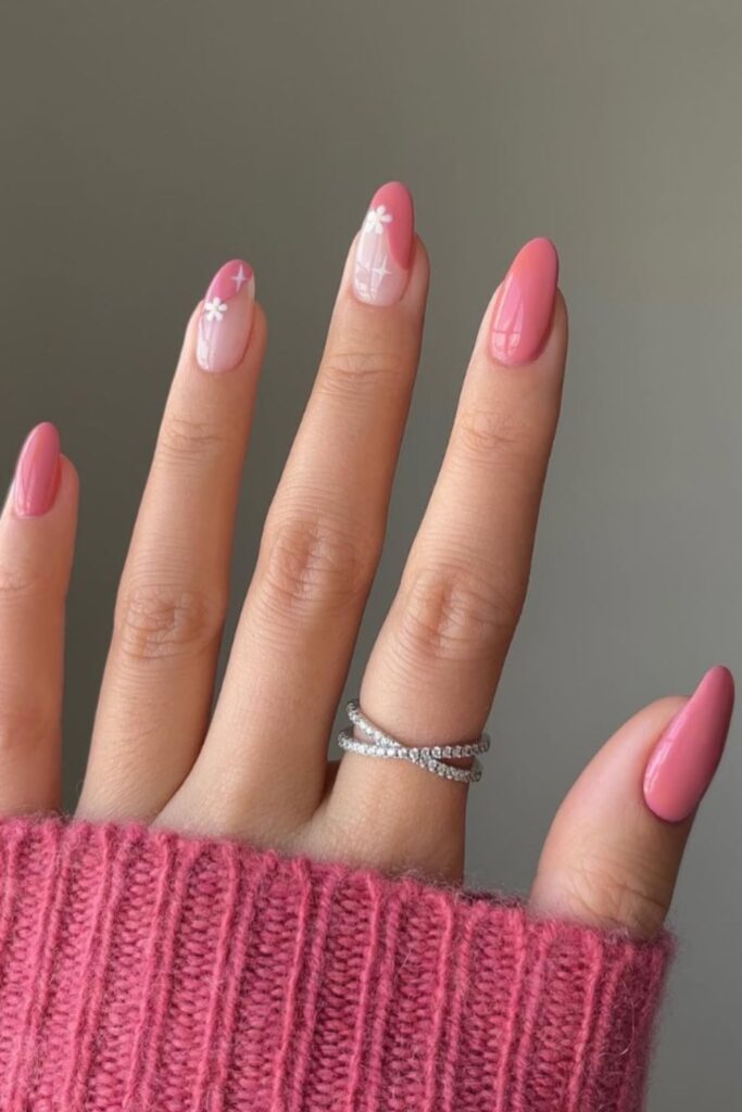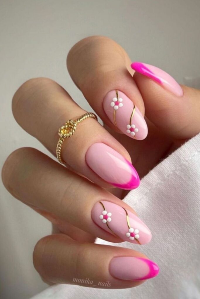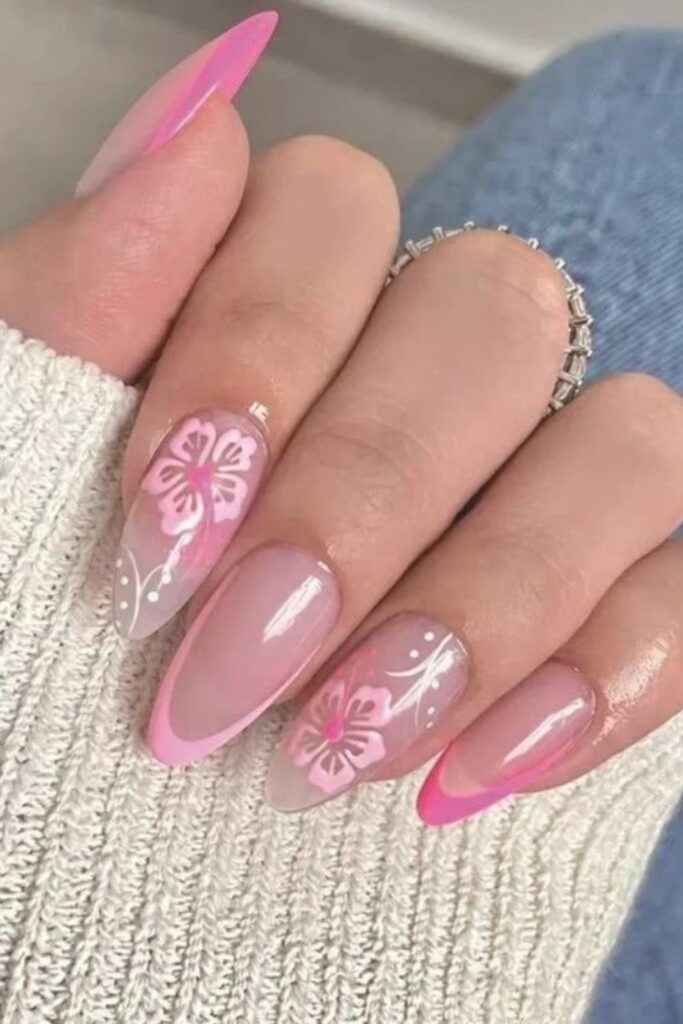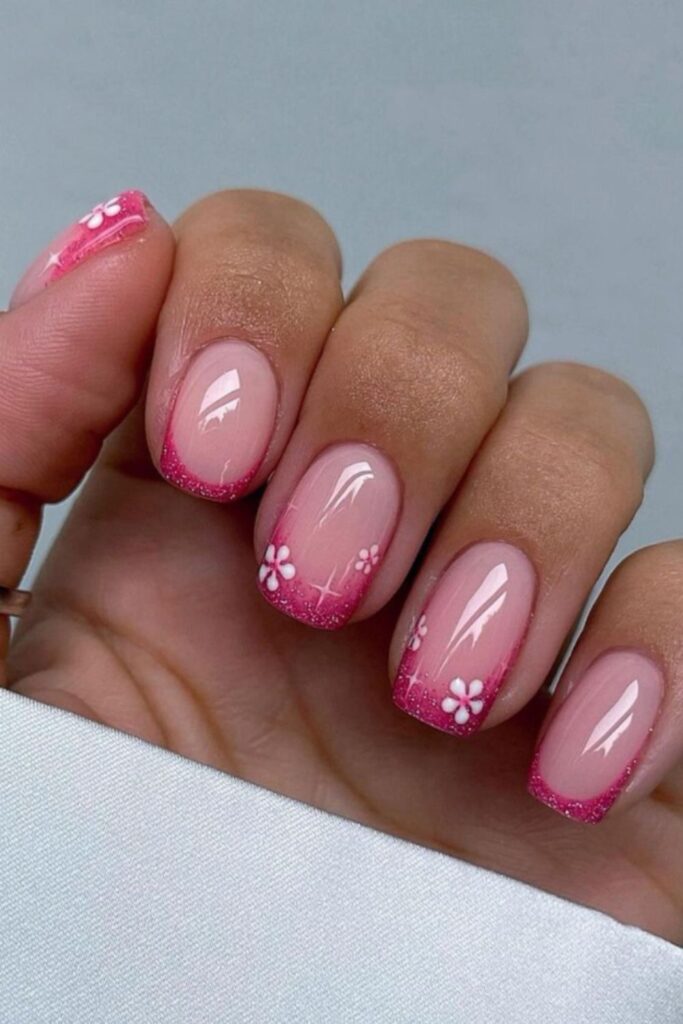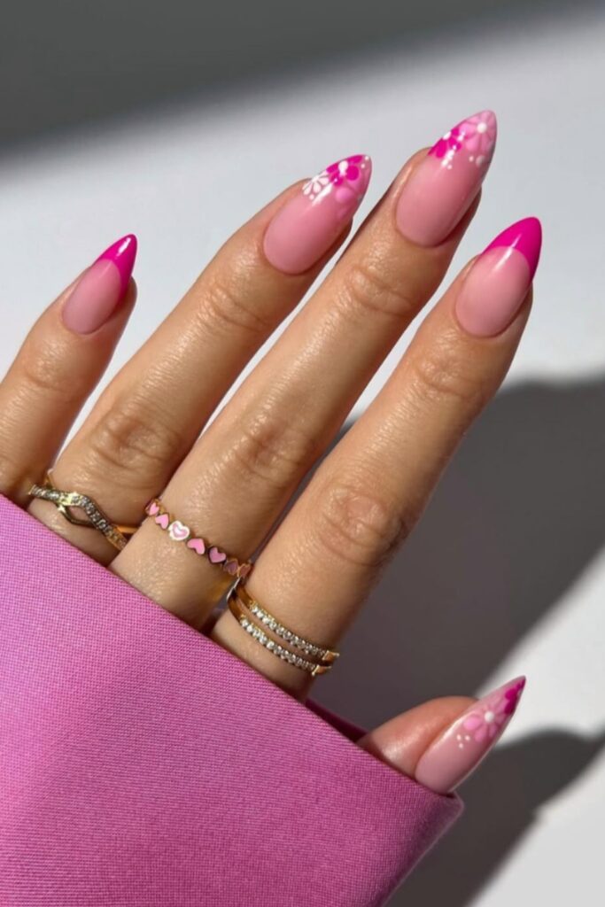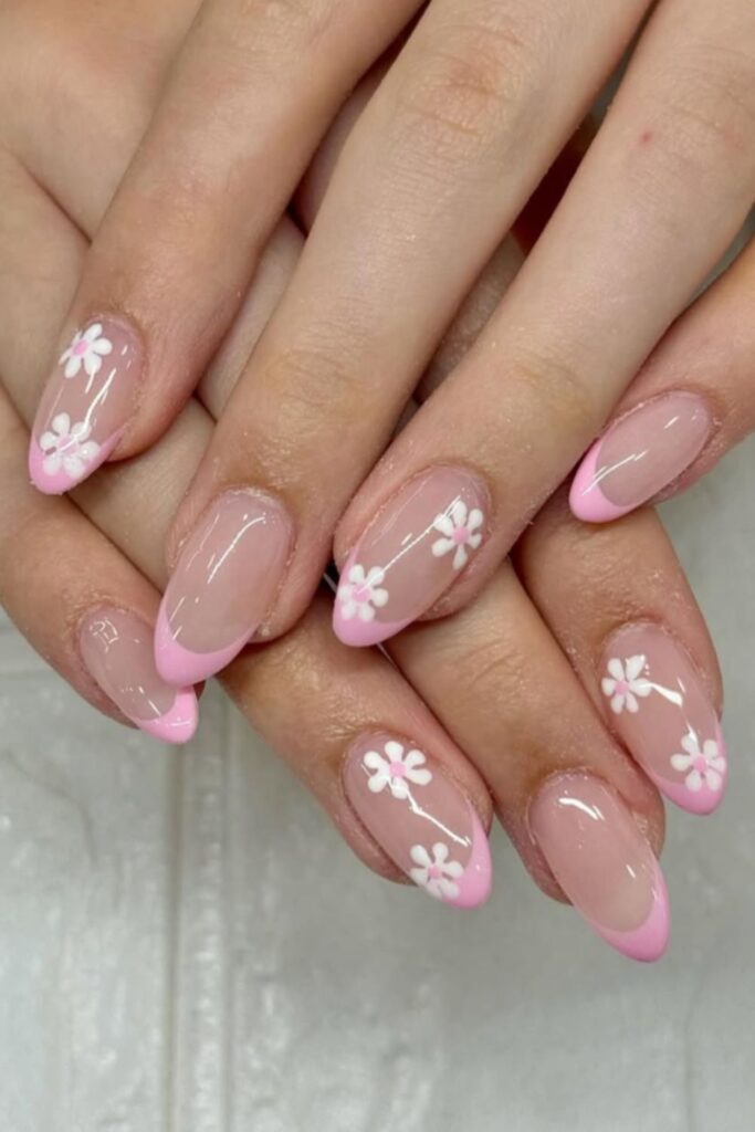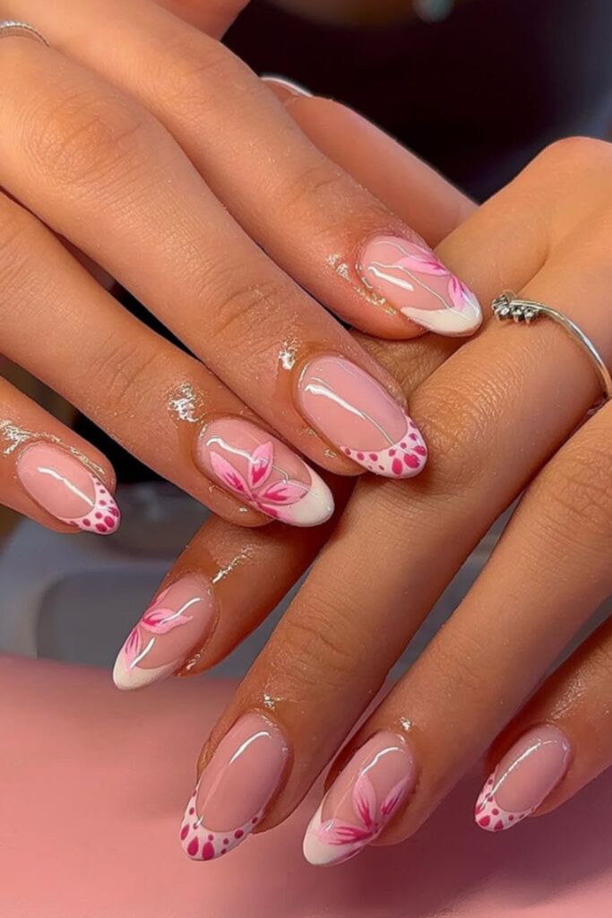 Traditional French tips get a fresh update with pink tones and floral accents. It’s a timeless style with a playful twist, making it perfect if you want something classic but not basic.