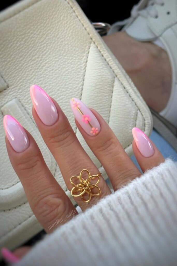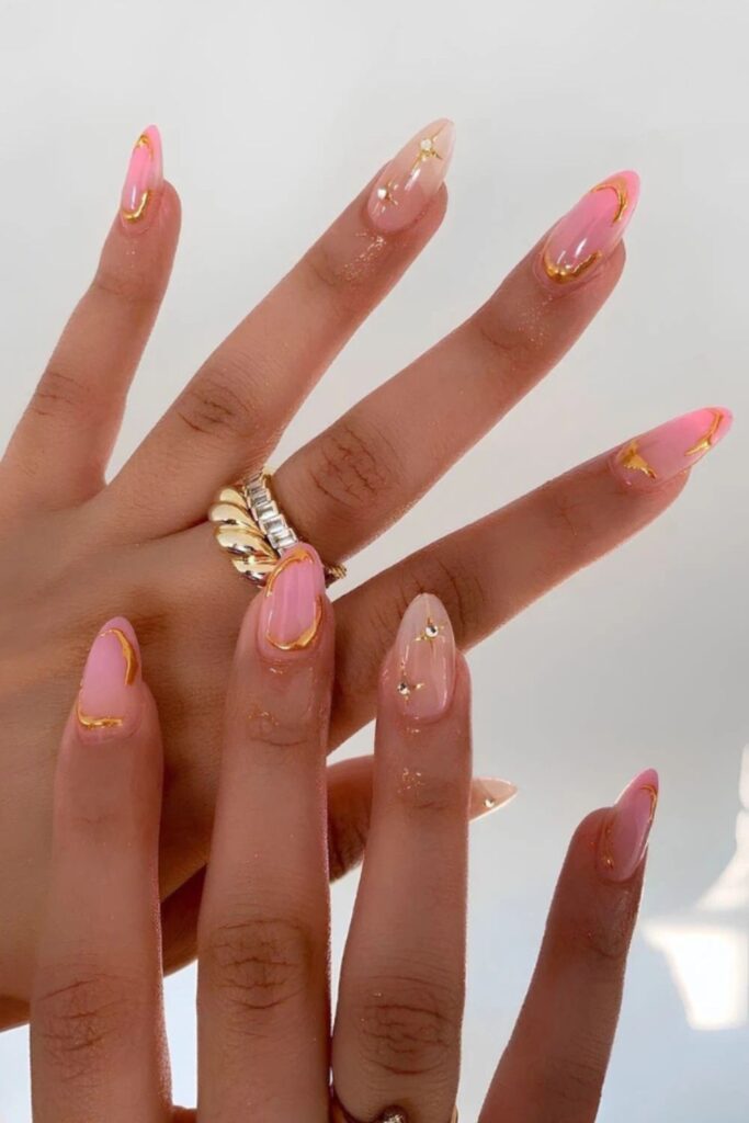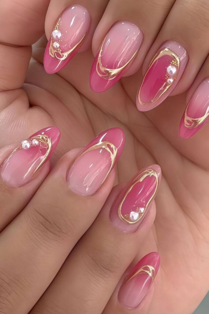 A smooth pink ombre creates that soft gradient effect, while gold accents add a touch of glam. It’s the kind of manicure that feels both elegant and eye-catching, giving you a polished look that still stands out.