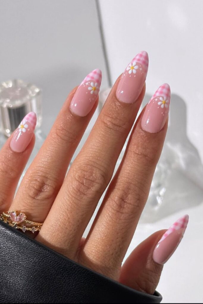 This design mixes retro checkerboard patterns with soft floral details for a look that feels both playful and feminine. It’s a fun contrast that somehow just works, giving your nails a trendy, artsy vibe while still keeping things cute and wearable.