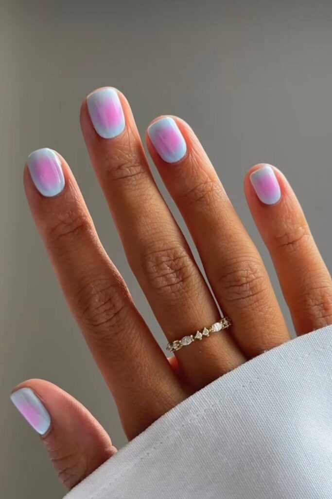 Soft aura nails bring a dreamy, diffused pop of color to short lengths without feeling overwhelming. This trend features a gentle “glow” of color blended into the center of the nail, creating a hazy, airbrushed effect that looks delicate and modern.