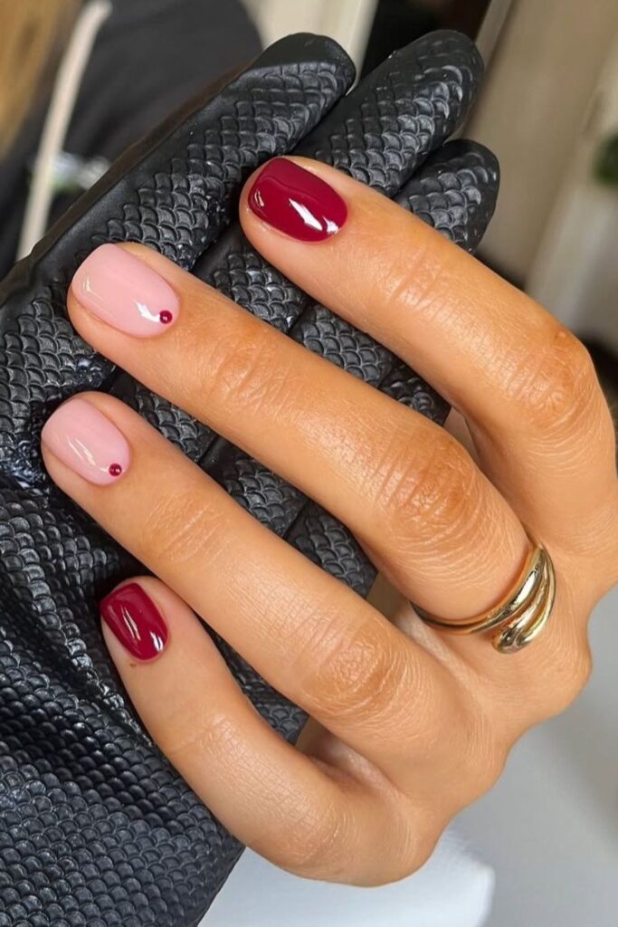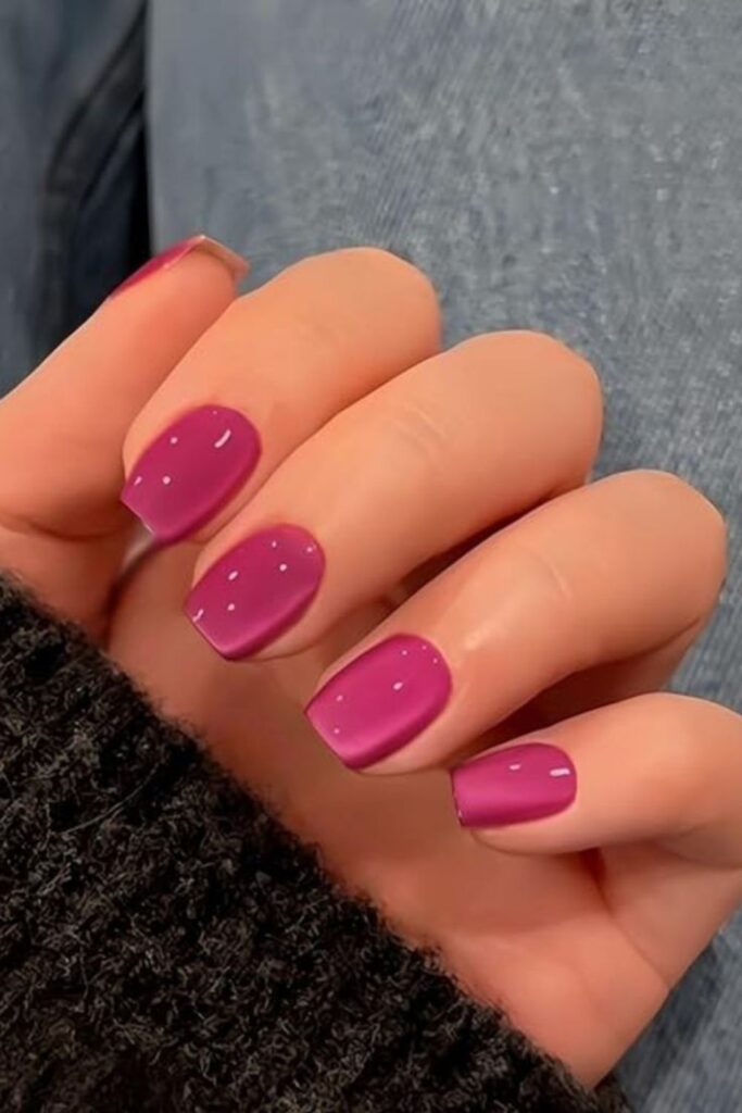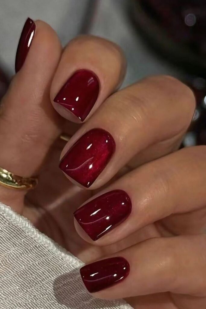 Deep plum, prune, and dark cherry tones are surging — Pinterest searches for dark plum nails are up significantly, and it’s not hard to see why. On a short nail, these shades create a jewel-like, refined effect that’s notably more interesting than the standard dark red.