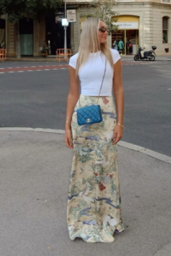 You can never go wrong with this combo. A simple tee tucked into a flowy, floral maxi skirt gives you that effortless, feminine look that’s basically made for spring brunch dates.