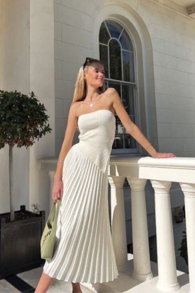 This combo is such a head-turner. An asymmetrical tube top with a pleated midi skirt gives you that trendy-meets-classy look that feels just right for spring.