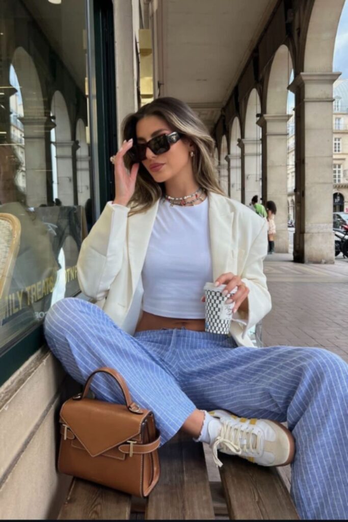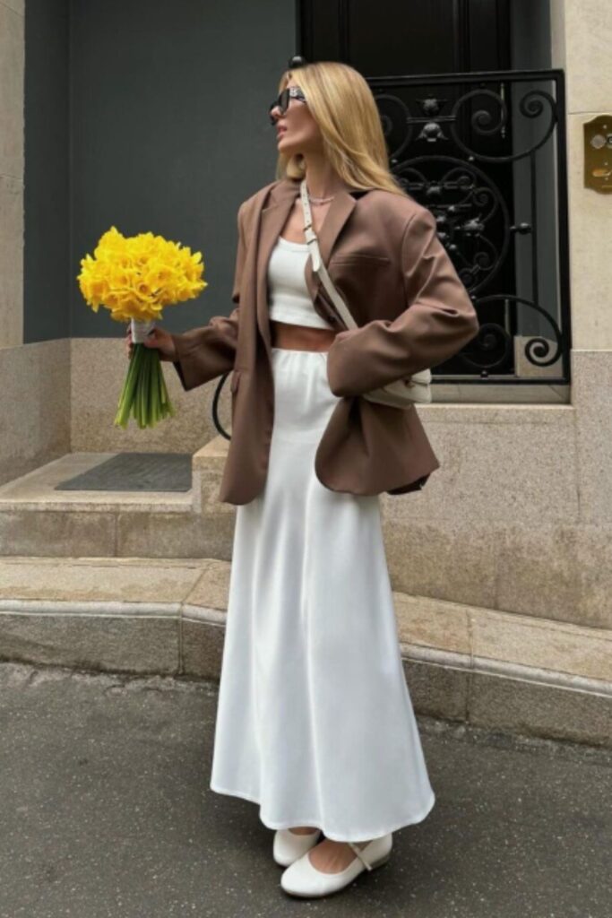 Another blazer moment, but make it soft and flowy. Pair it with a crop top and a maxi skirt for a look that’s equal parts chic and relaxed—perfect for outdoor brunch.