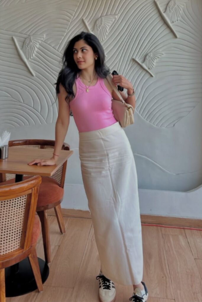 This pairing is simple but so stylish. A fitted vest top with a flowy maxi skirt lets you play with textures and colors while keeping things light and spring-ready.