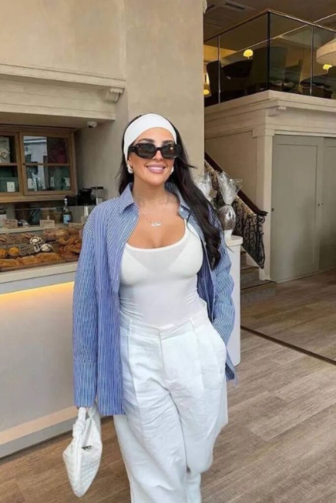 This outfit screams “I just threw this on and still look amazing.” Layer a relaxed striped shirt over a simple tank, then add pleated linen pants for that breezy, cool-girl brunch vibe.
