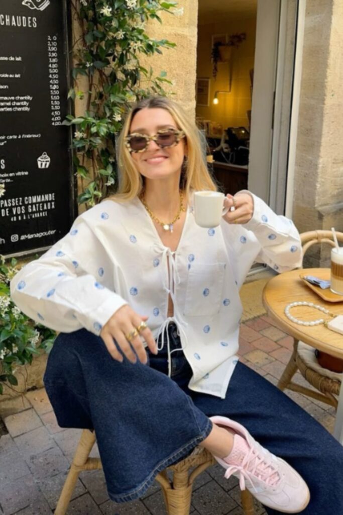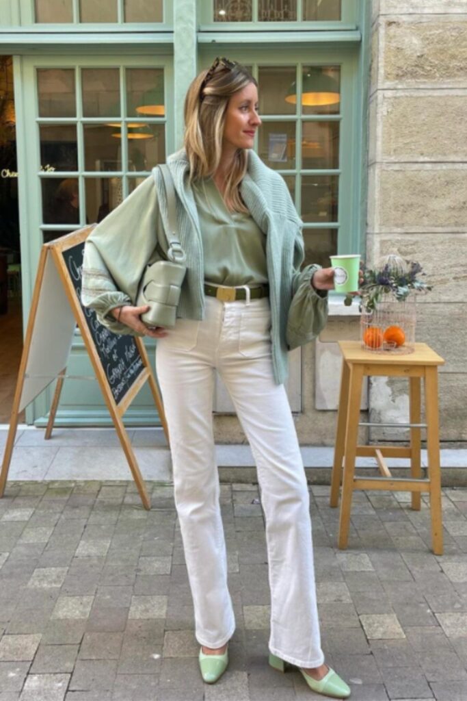 There’s something about a satin shirt and crisp white jeans that just feels like spring. It’s clean, fresh, and effortlessly elevated. Toss a light knit over your shoulders for that extra “I have my life together” touch.