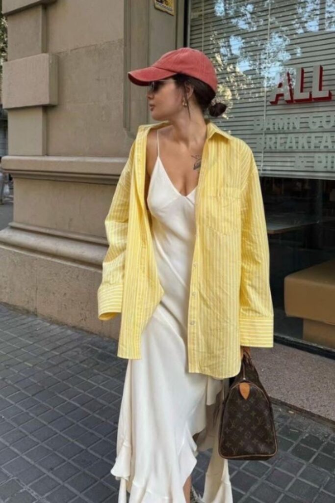 This look is such a vibe. Throw an oversized button-down over a silky satin dress for that effortless, slightly undone aesthetic. Perfect for those breezy spring mornings.