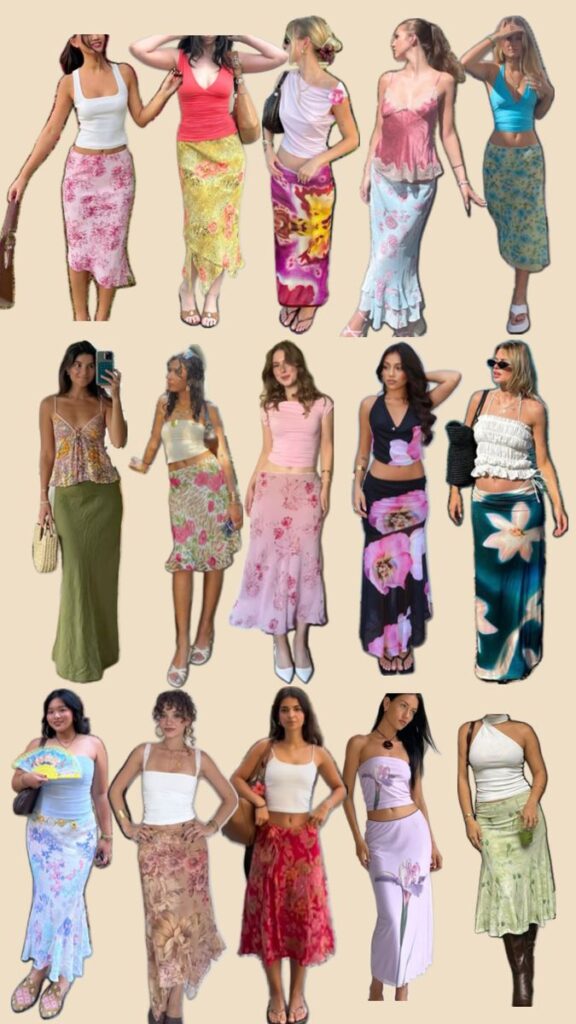 Colorful, fun, and just straight up spring vibes— floral skirts are everywhere, styled casually for daytime or elevated for evenings. Usually, they are styled with long, oversized t-shirts or matching tops.