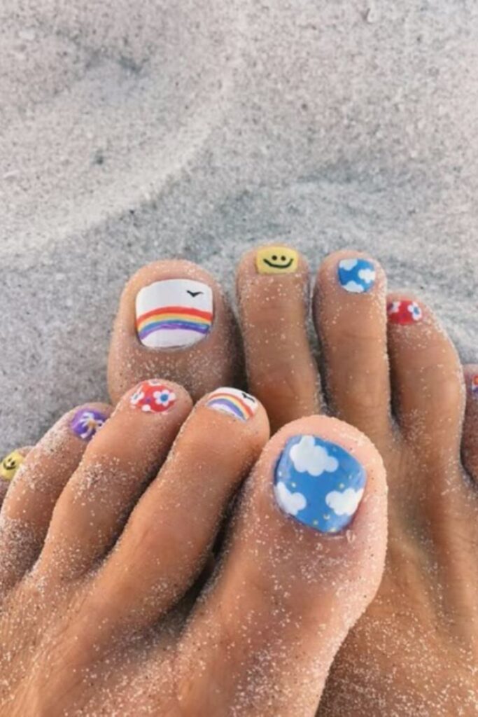 Rainbows, smileys, clouds, and florals bring personality without feeling chaotic. Perfect if you love playful nails; anchor the look with a neutral base shade.