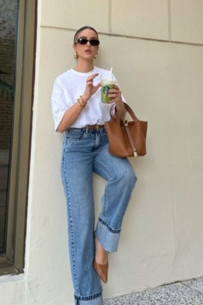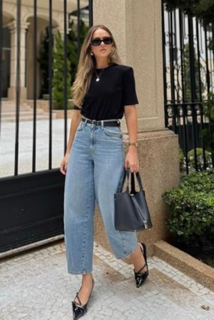 A basic tee with mom jeans can totally work for business casual—as long as the fit is intentional. It’s great for relaxed office environments or work-from-anywhere days. Elevate it with a more structured tee and sleek shoes so it doesn’t feel too laid-back.