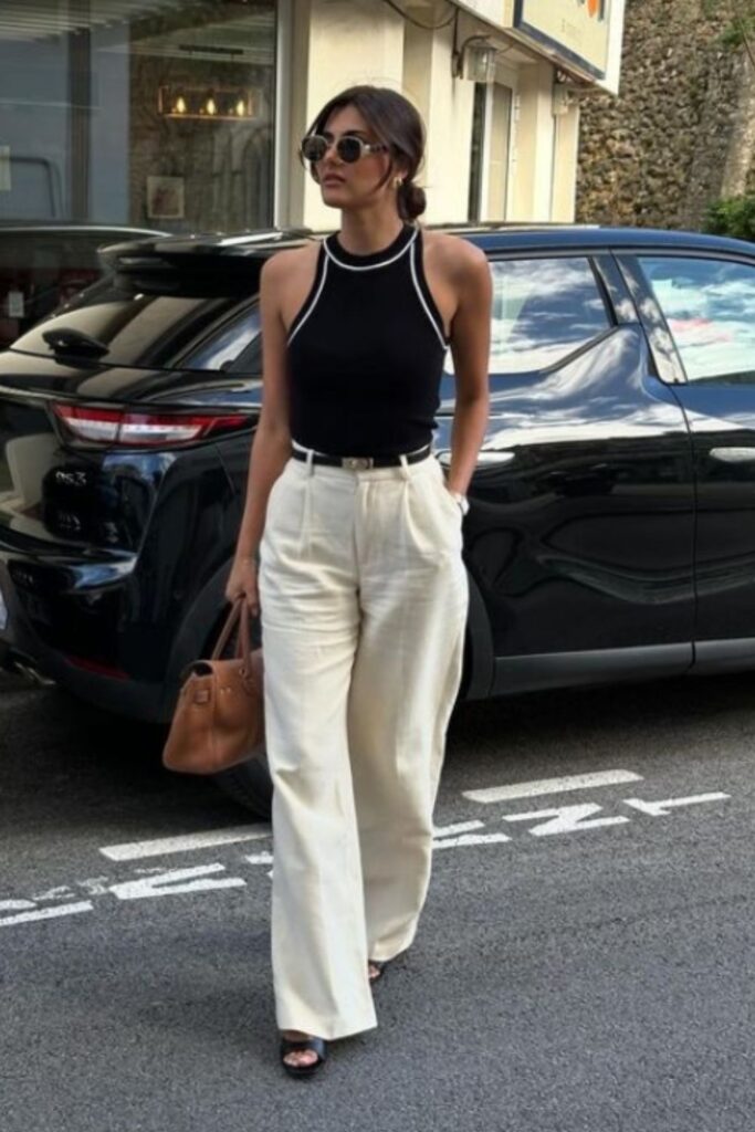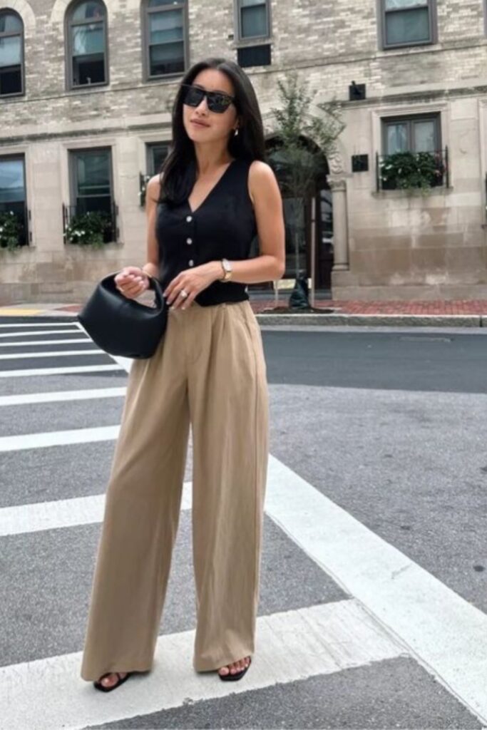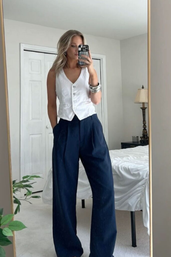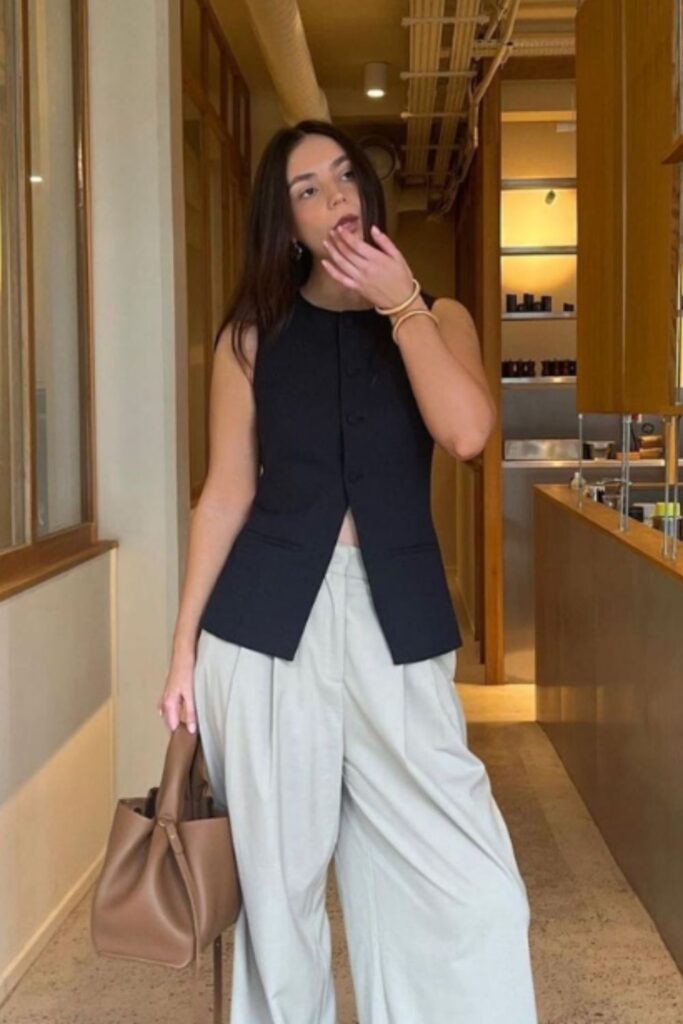 A vest top paired with wide-leg tailored pants creates a flattering, effortless silhouette. It’s perfect for long days when comfort is key but you still want to look polished. Keep the vest fitted to balance out the flowy trousers.