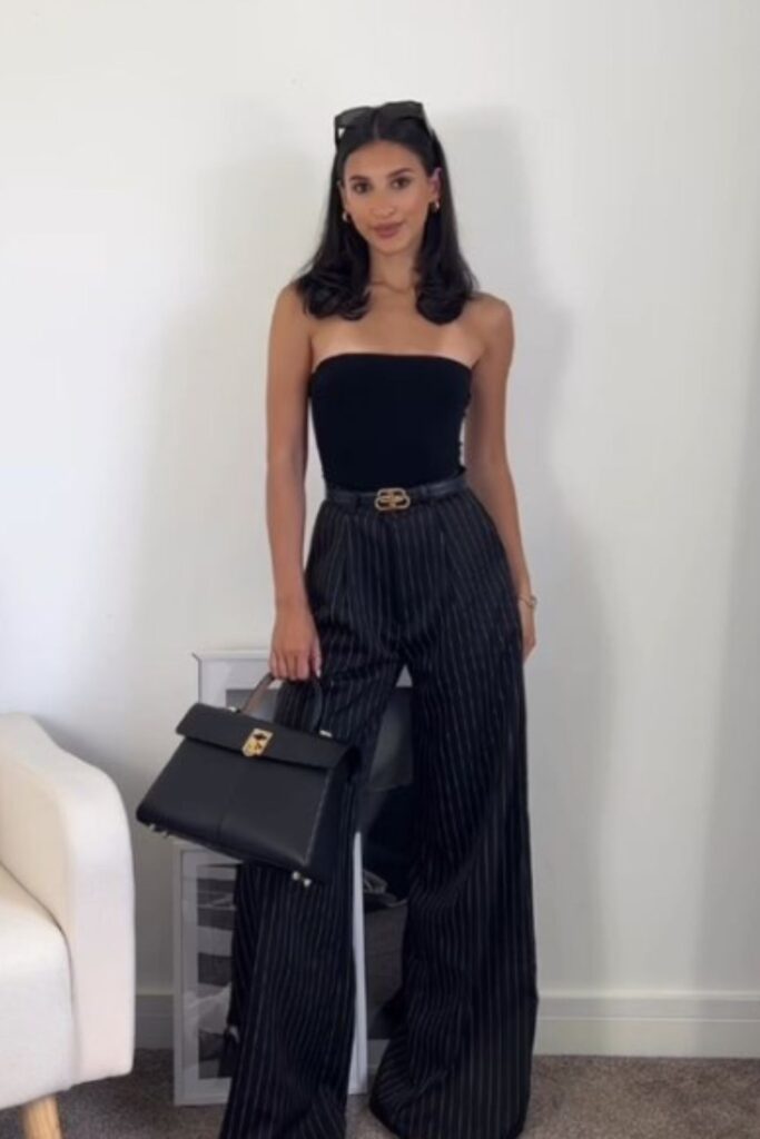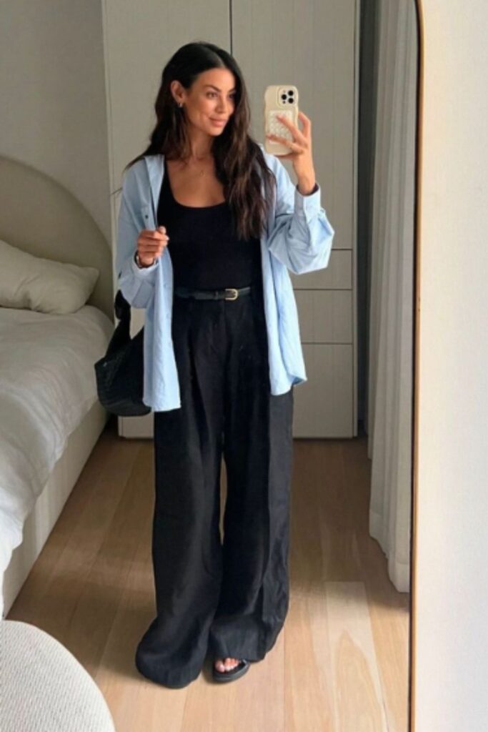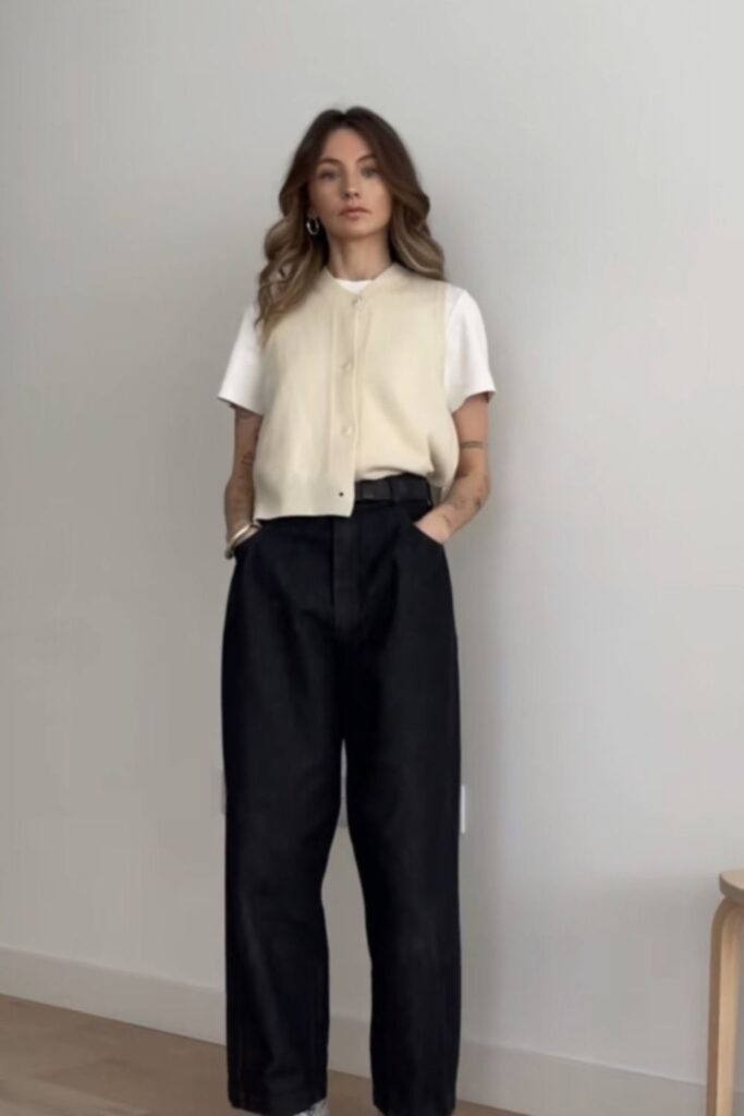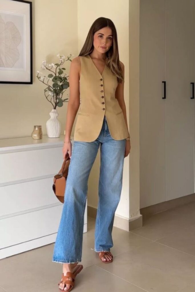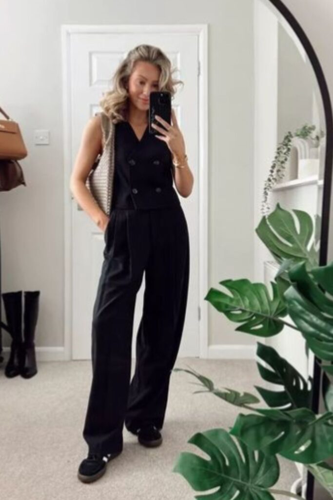 A vest top paired with wide-leg tailored pants creates a flattering, effortless silhouette. It’s perfect for long days when comfort is key but you still want to look polished. Keep the vest fitted to balance out the flowy trousers.