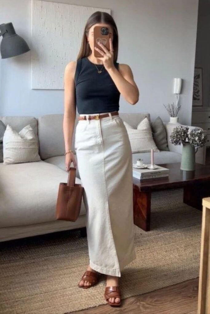 A ribbed vest with a white skirt feels light, fresh, and surprisingly office-friendly. It’s perfect for those extra hot days when trousers are just not an option. Stick to soft, clean colors for an effortless summer work look.