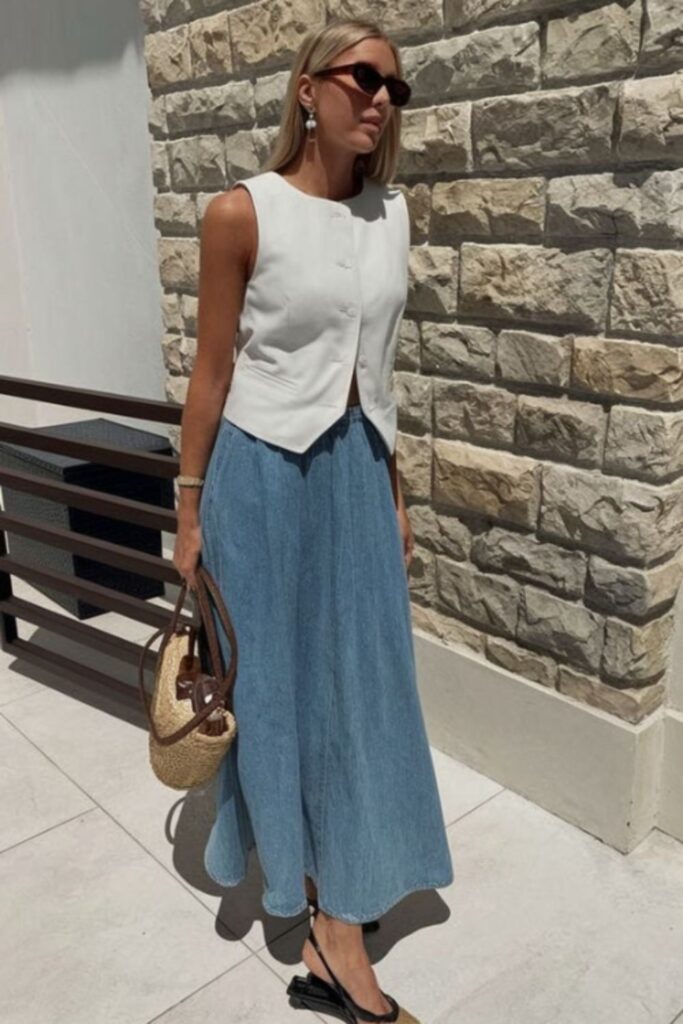 Pairing a waistcoat with a denim maxi skirt gives you that perfect mix of structure and ease. It’s a great option for fashion-forward or creative workspaces. Lighter denim and a crisp waistcoat keep the look feeling fresh and professional.