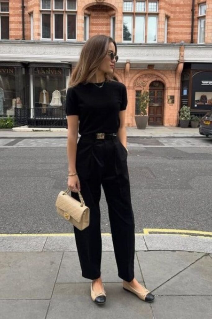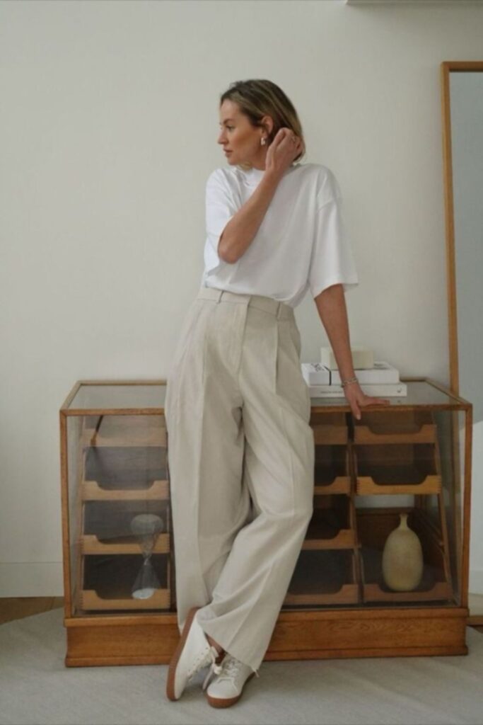Switching denim for pleated pants instantly upgrades your basic tee. This combo feels relaxed but still office-appropriate, especially in soft, neutral tones. It’s perfect for those days when you want comfort without sacrificing style.