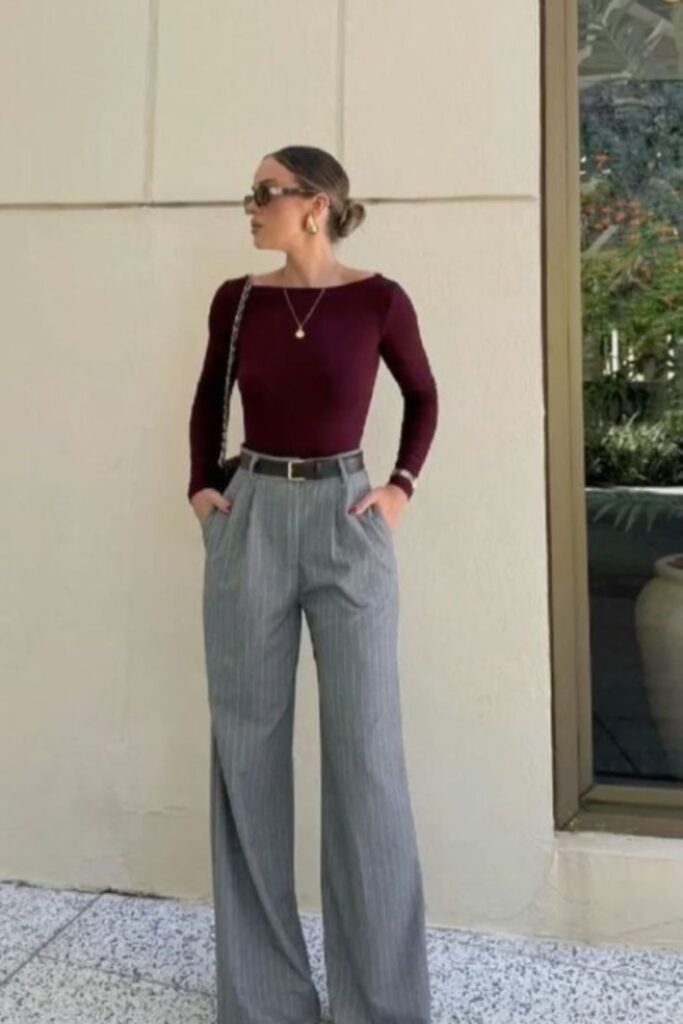 A fitted top with tailored trousers creates a clean, flattering silhouette that works perfectly in the office. It’s an easy go-to when you want something simple but still polished. Add delicate jewelry to tie the look together.