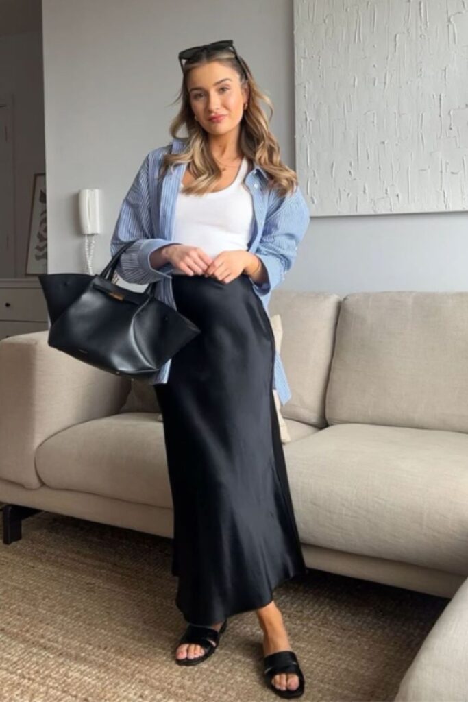 A satin skirt paired with a simple tee creates the perfect mix of casual and elevated. It’s light, breathable, and ideal for warmer days. Add minimal accessories to keep the look refined without overdoing it.