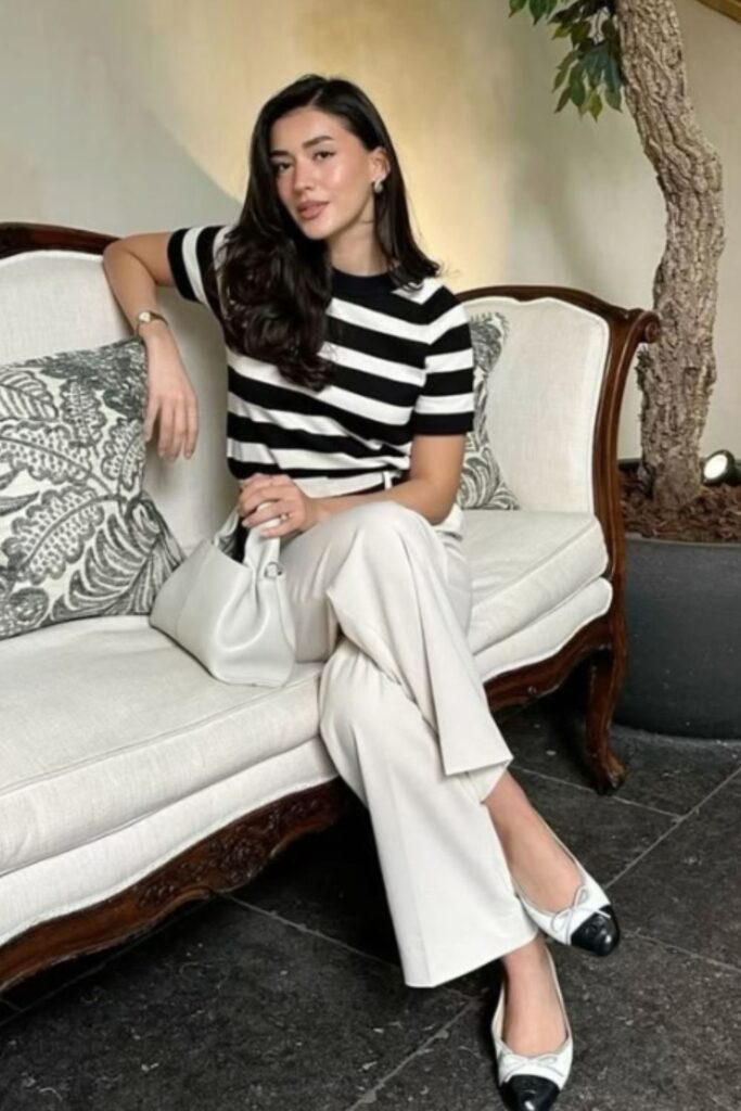 This combo blends comfort with structure in the best way. A striped tee adds a relaxed vibe, while tailored pants keep everything looking sharp. It’s perfect for everyday wear when you want something easy but still office-ready.