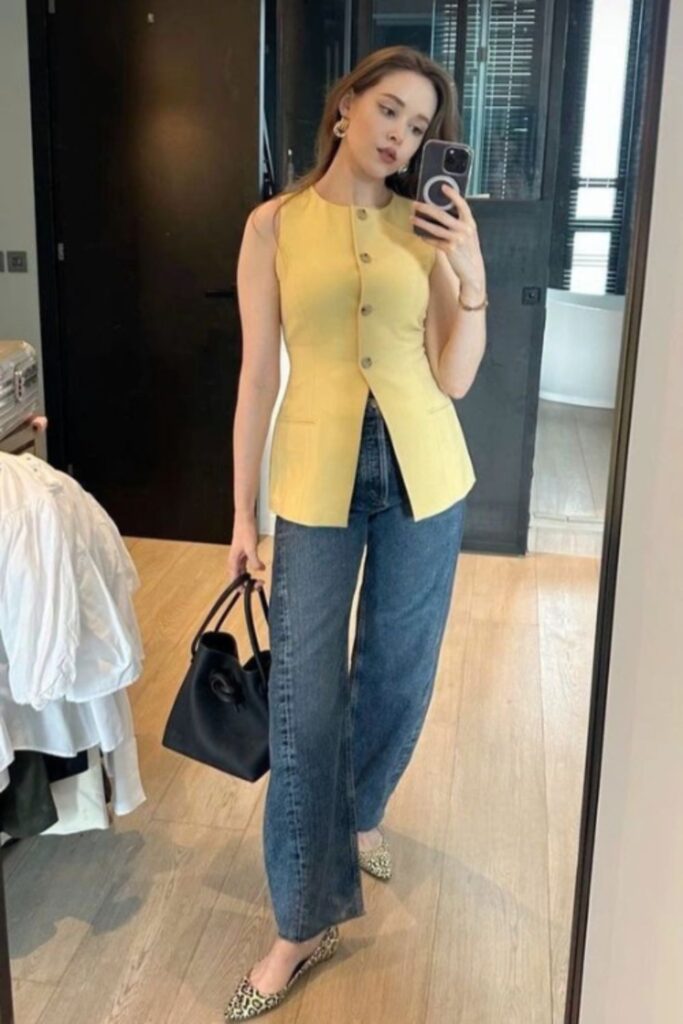 A waistcoat styled with denim is an easy upgrade to your everyday jeans look. It works well in offices that lean more casual but still expect some polish. Add a structured bag or minimal jewelry to sharpen the overall vibe.