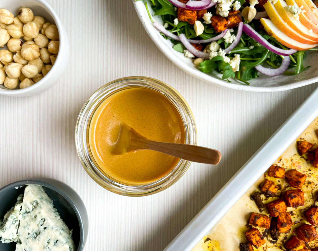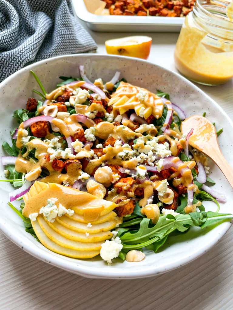 This salad is everything I want when I’m in the mood for something fresh but comforting. It has warm, spiced sweet potatoes, peppery baby arugula, sweet juicy pears, sharp blue cheese, and the crunch of toasted hazelnuts. Plus, the whole thing gets tossed in a zingy Dijon-honey vinaigrette that pulls it all together like the cozy sweater you never want to take off.