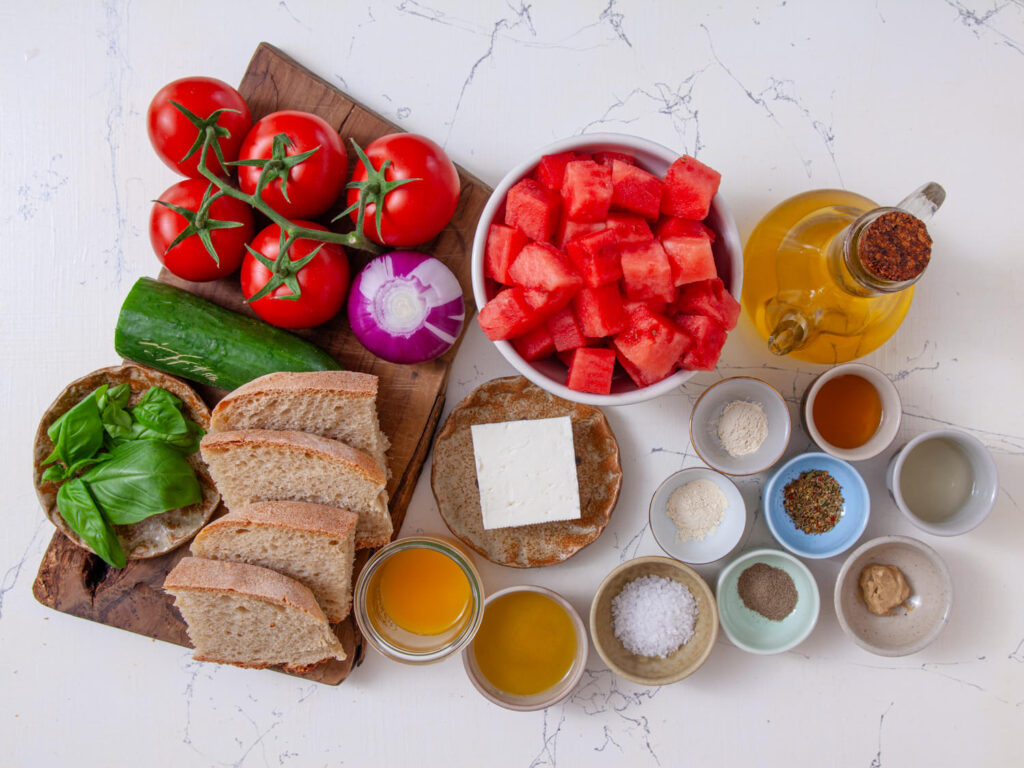Panzanella, if you’re not familiar, is an Italian bread salad traditionally made with day-old bread, juicy tomatoes, cucumbers, onions, and basil tossed in a zingy vinaigrette. But we’re giving it a sweet twist — we’re tossing in sweet, refreshing watermelon to keep you cool and happy when it’s hot outside. Think sweet and savory, crunchy and juicy, all in one bowl. Hungry yet? Let’s get into it.