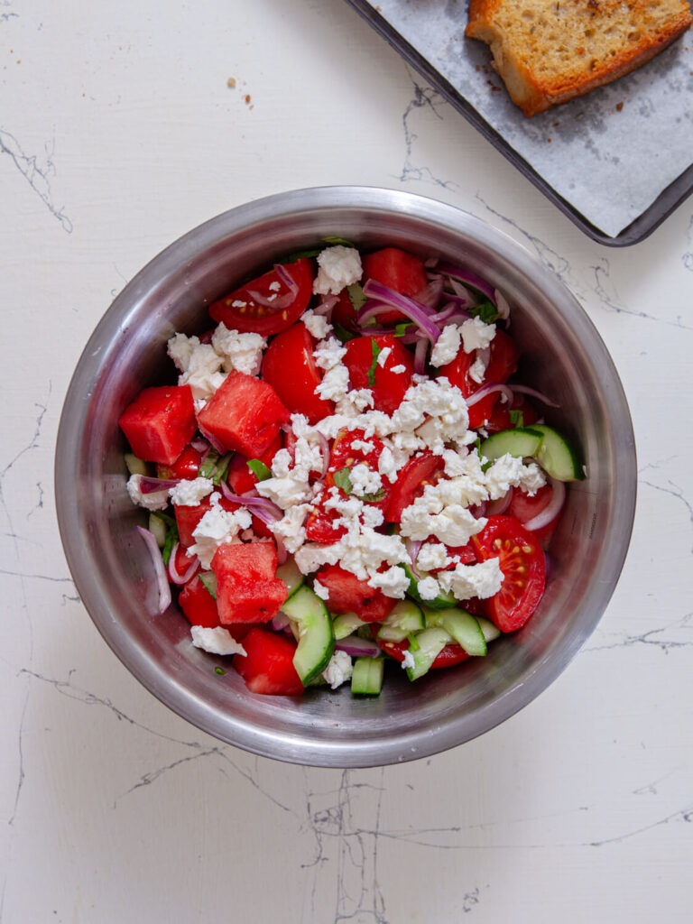 - Add the balled or cubed watermelon, sliced cucumber, fresh basil, and two ounces of crumbled Feta to the bowl with the seasoned tomatoes and red onion. Gently toss to combine and set aside.